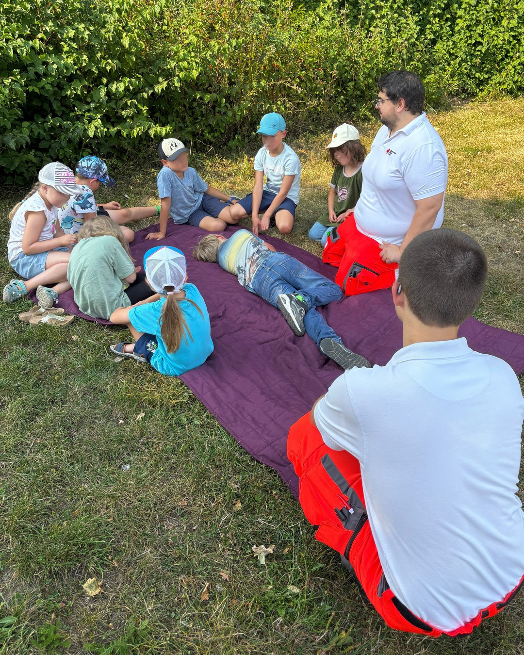 Dann konnte an drei Stationen verschiedenes angeschaut und ausprobiert werden. Los ging’s mit dem, was bei uns „Auffindeschema“ heißt … also Dinge, die man tun kann, wenn man eine hilflose, verletzte oder sogar bewusstlose Person findet. Das beginnt mit dem Ansprechen und Anfassen sowie dem Absetzen eines Notrufs. Auch lernten wir gemeinsam, wozu die Lagerung in stabiler Seitenlage gebraucht wird … und wie man’s macht 😁📞