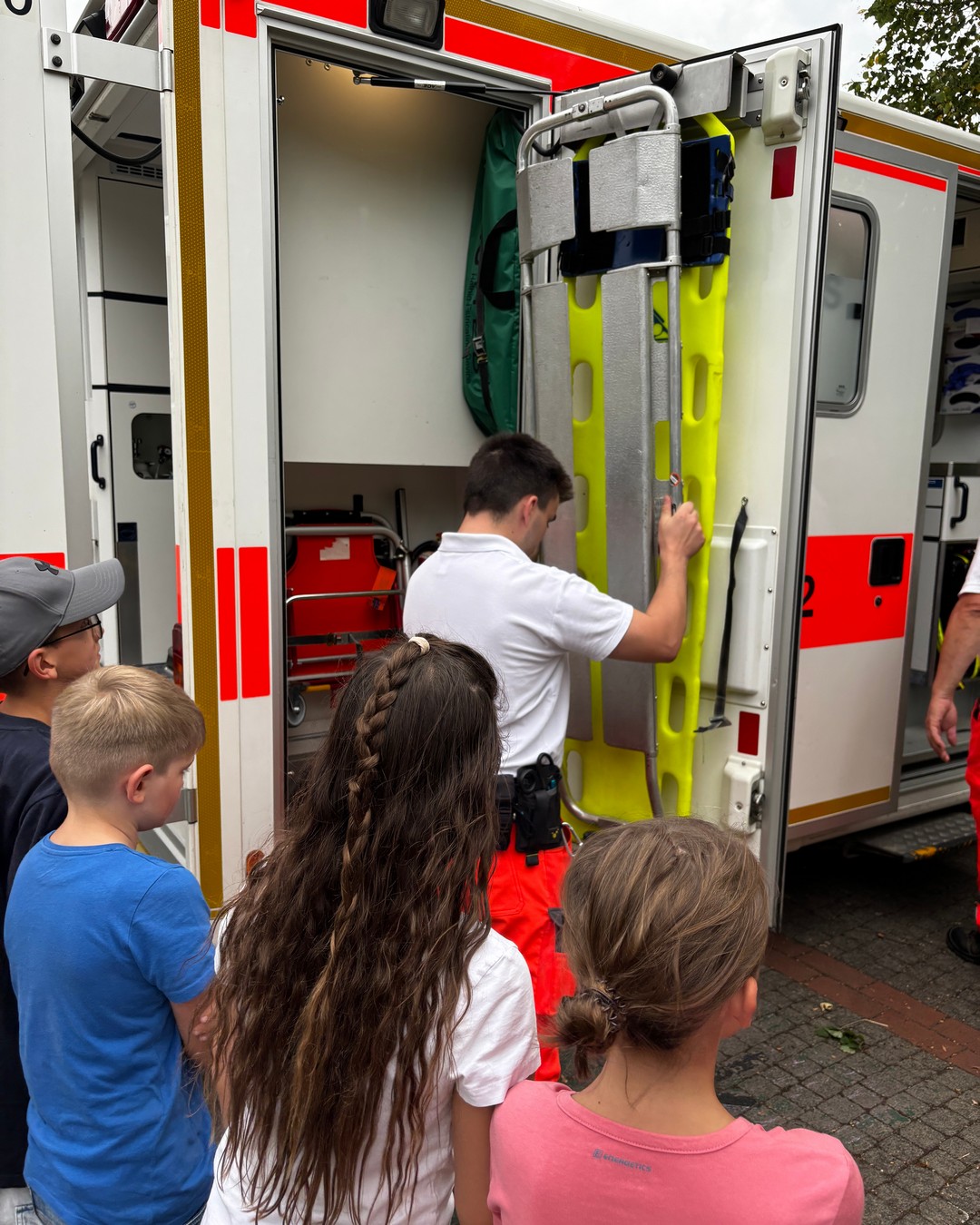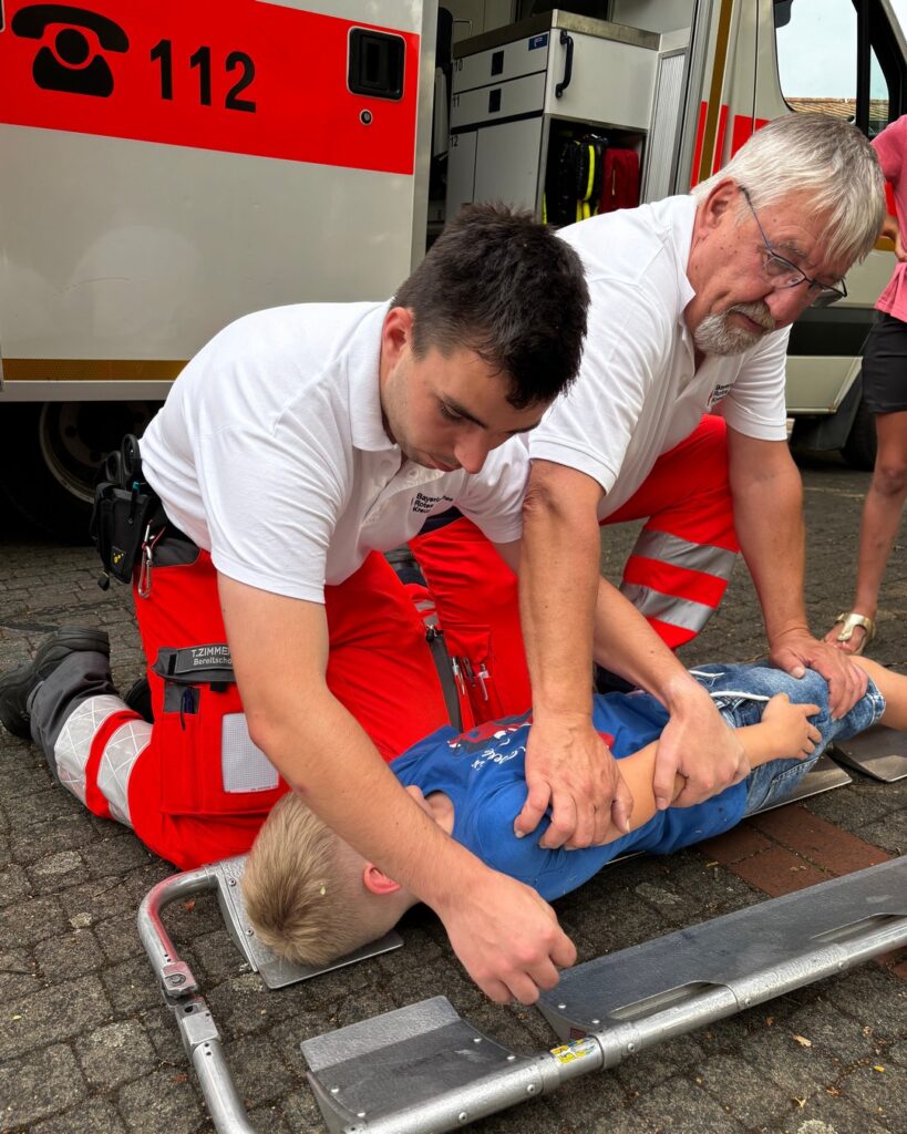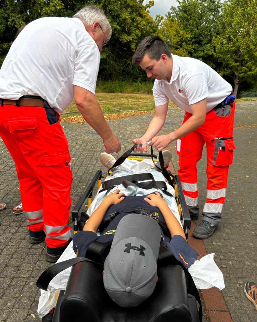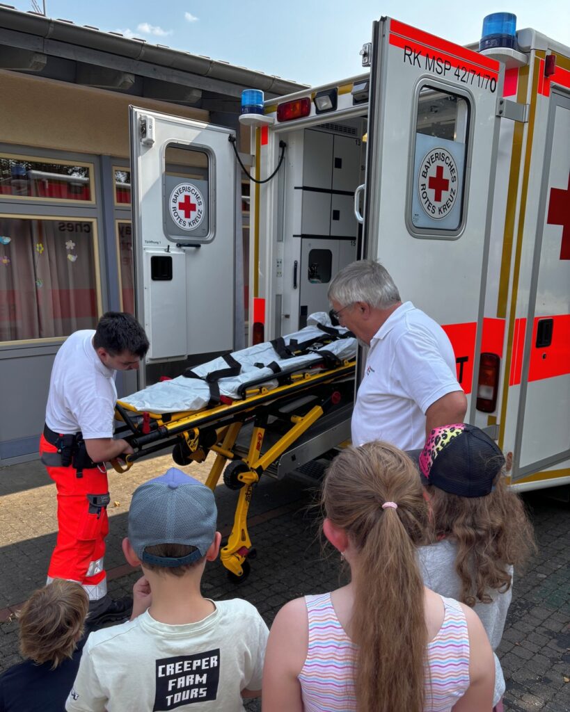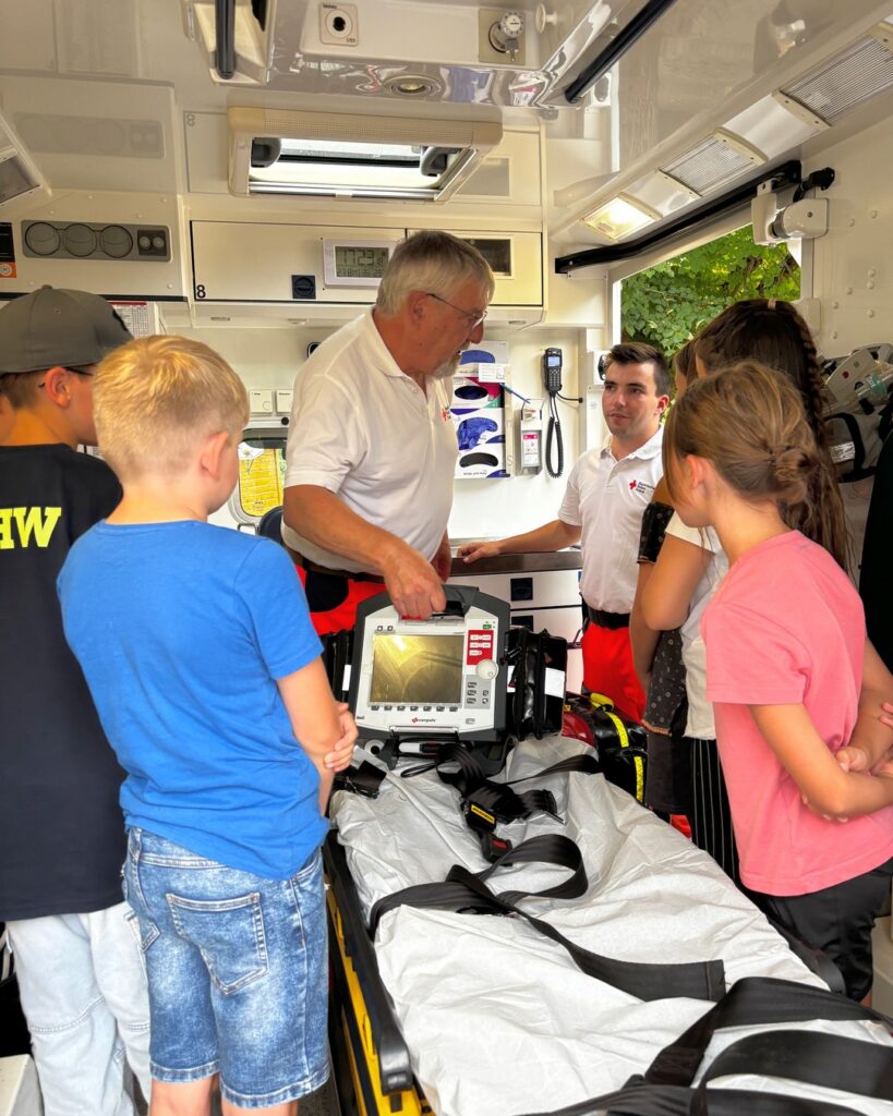 Zwischendurch gab’s eine Pause mit Obst, Getränken und Kuchen. So gestärkt ging’s an die dritte Station: am und im Rettungswagen gibt es allerhand Geräte zu entdecken. Mit der Krankentrage kann ein Verletzter aufgenommen und zum Auto transportiert werden. Ist die Lage schwierig, hilft dabei zum Beispiel die Schaufeltrage. Knochenbrüche können mit der Vakuum-Schiene oder der Vakuum-Matratze fixiert werden. Im Auto angekommen zeigt der Patientenmonitor die Funktion von Atmung und Kreislauf an. Bei Bedarf kann mit Sauerstoff oder vielen anderen Medikamenten behandelt werden 🚑💉