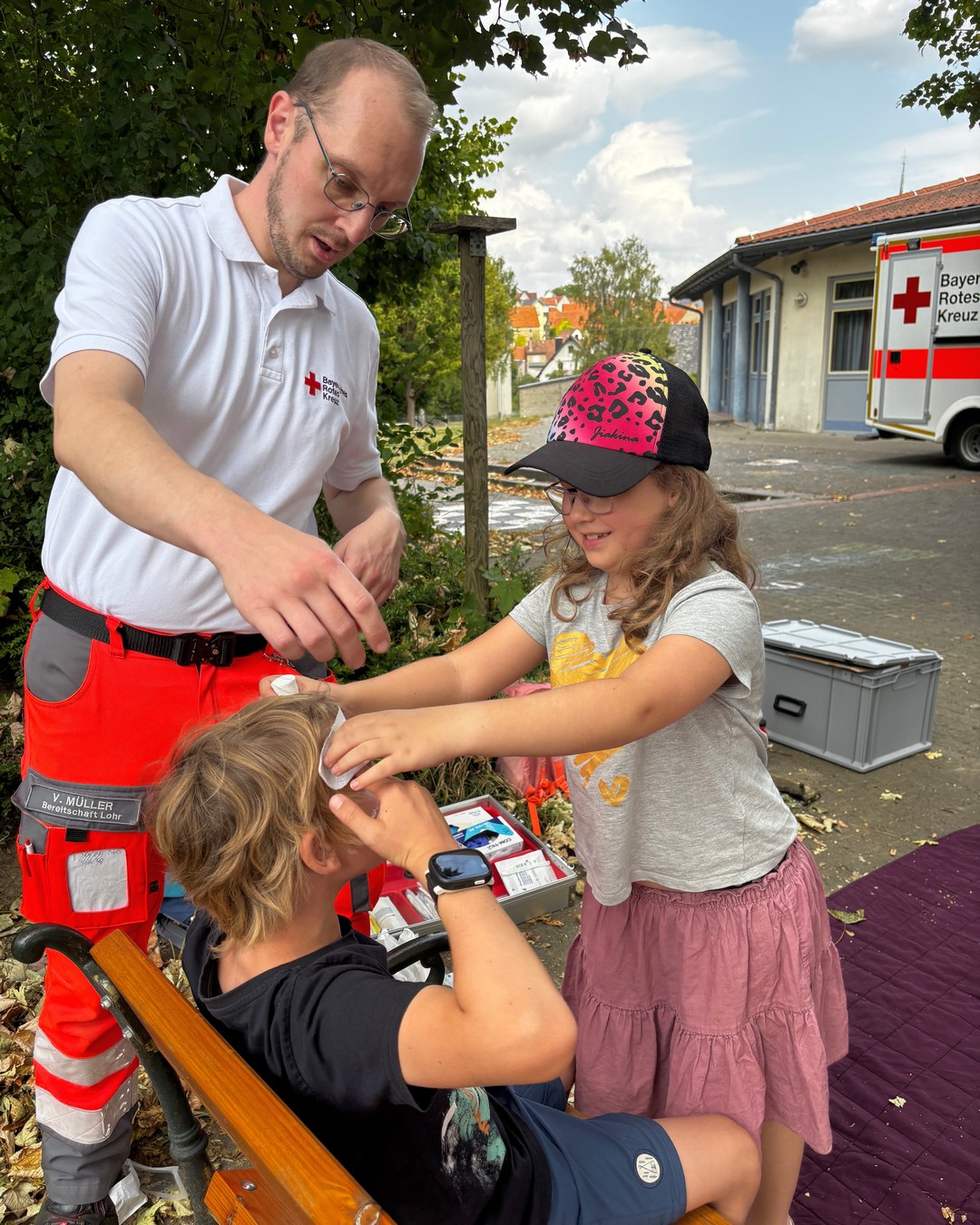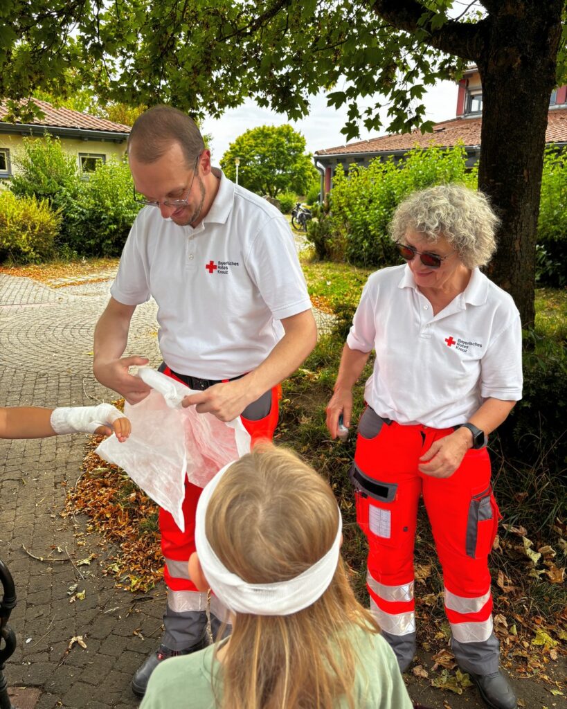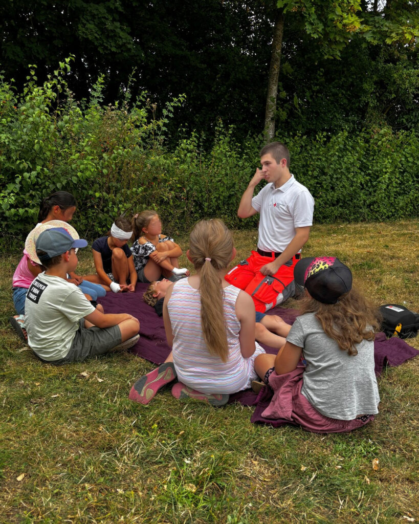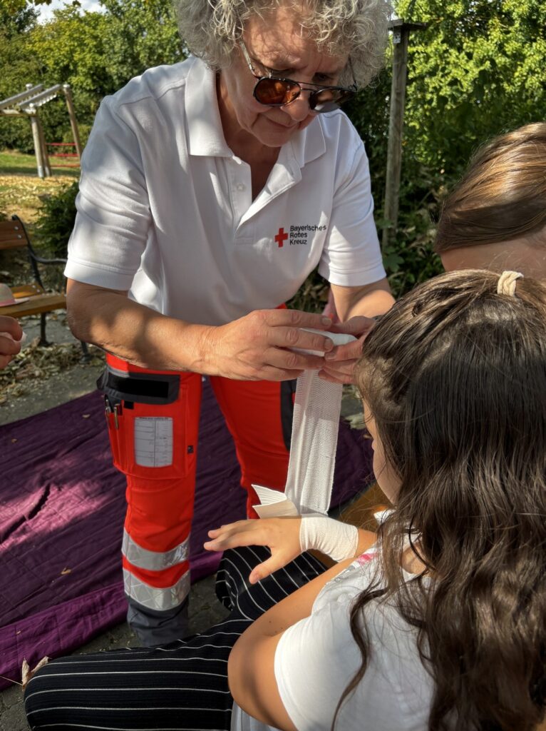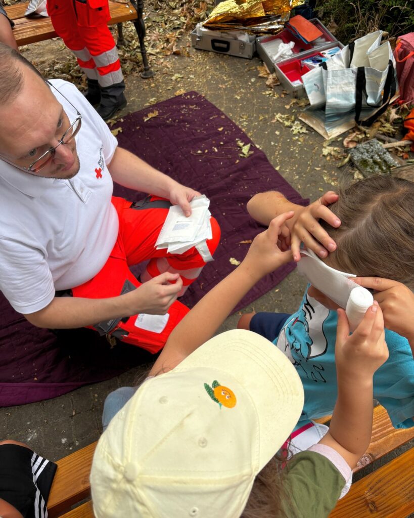 An der nächsten Station wurde die Versorgung von Wunden mit Verbänden geübt. Je nach Lage der Verletzung an Kopf, Ellenbogen oder Hand gibt’s verschiedene Tricks, damit ein Verband gut hält und nicht wieder aufgeht. Ein Tragering ist schnell gebastelt – zwei Leute können so eine dritte, verletzte Person sicher und einfach wegtransportieren 🩹🩸🤝🏻