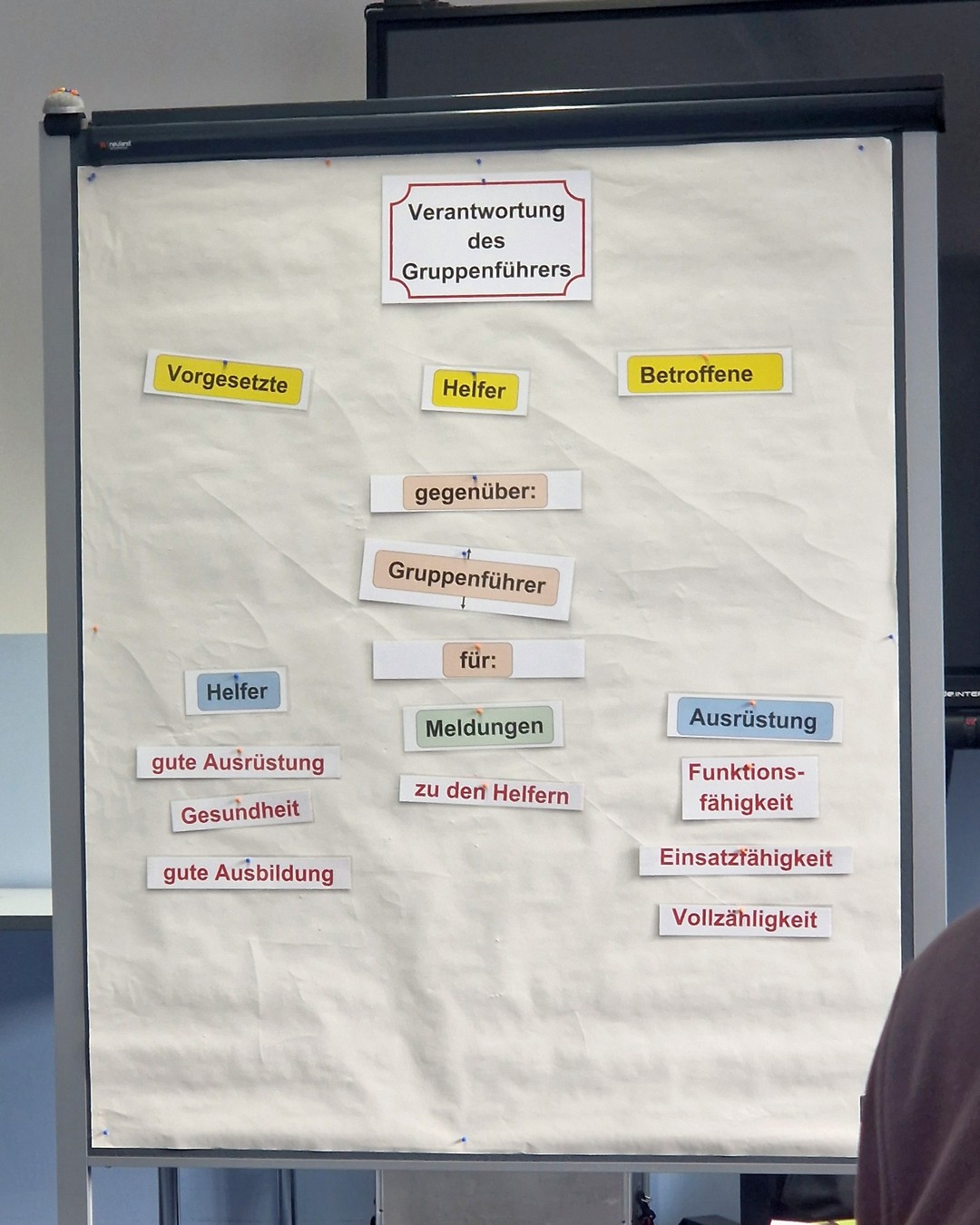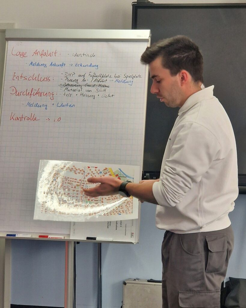 In diversen Theorie-Einheiten ging es um die Aufgaben der Schnelleinsatzgruppe T+S, die Verantwortlichkeiten des Gruppenführers und die Schnittstellen zu anderen Einheiten und Organisationen. Die Inhalte zur Einsatztaktik konnten zwischendurch immer wieder in der Gruppe in spannenden Planspielen angewendet werden – so mussten bei einem angenommenen Sturm ein Behandlungsplatz errichtet oder nach einem Chemieunfall eine Notunterkunft errichtet und betrieben werden.