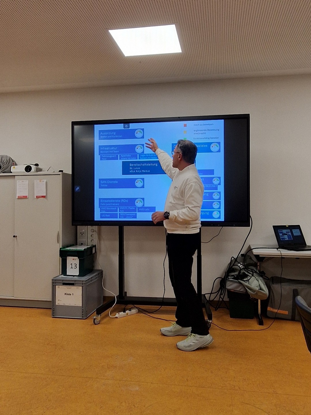 Auch im Bereich Infrastruktur und Fahrzeuge wurden von Bertram und seinem Team große Fortschritte gemacht, was die Ausrüstung der Fahrzeuge, Materialvorbereitung sowie Lagerräume und Ordnung angeht. Volker spricht in Sachen Öffentlichkeitsarbeit und Mitgliedergewinnung über regelmäßige Berichterstattung, viele Veranstaltungen an Schulen und Festen sowie die Entwicklung eines Onboarding-Prozesses mit Informationen für neue Bereitschaftsmitglieder. Juliane zeigte sich sehr zufrieden mit der an den Blutspende-Terminen erreichten Spenderzahl und freut sich, dass ihr starkes Team selbstständig und zuverlässig funktioniert.