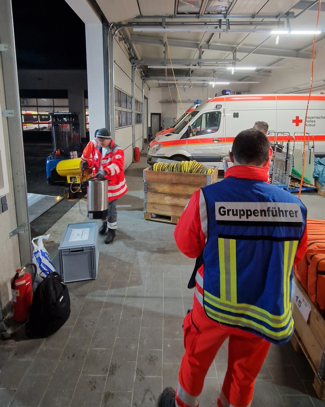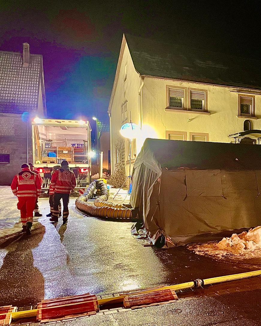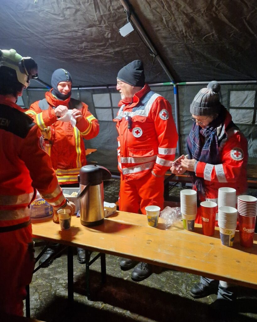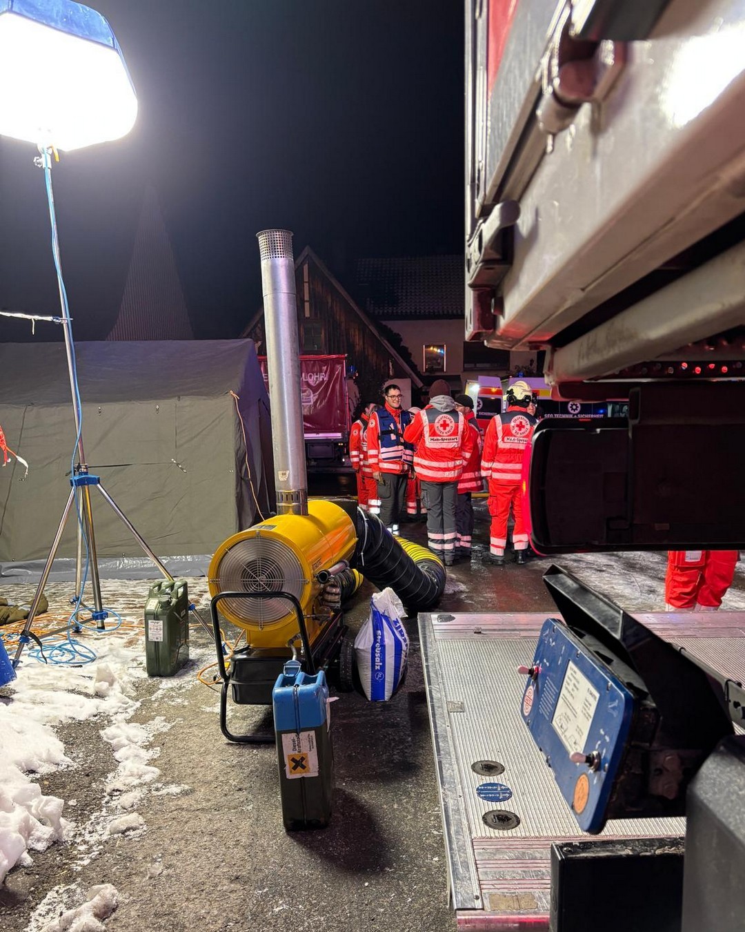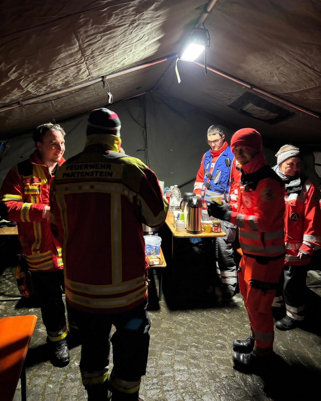 So wurde um 21:49 Uhr durch den Einsatzleiter Rettungsdienst auch unsere SEG Technik + Sicherheit mit den Gerätewagen Technik sowie Gw Logistik alarmiert. Vor Ort stellten wir ein SG30-Zelt auf und bestückten dieses mit Biertischgarnituren. Über den Stromerzeuger wurde das Umfeld und das innere des Zelts beleuchtet, über die Zeltheizung behagliche Wärme geschaffen. Nach dem Eintreffen der SEG Betreuung aus Gemünden und Arnstein (@brk_arnstein) konnten zunächst warme und kalte Getränke sowie Snacks an die Feuerwehrleute und THWler ausgegeben werden, später gab es auch eine Gulaschsuppe als Warmverpflegung. Außerdem wurden von uns Einsatzleitwagen sowie ein Beobachtungspunkt der Feuerwehr mit Infrarotstrahlern beheizt.